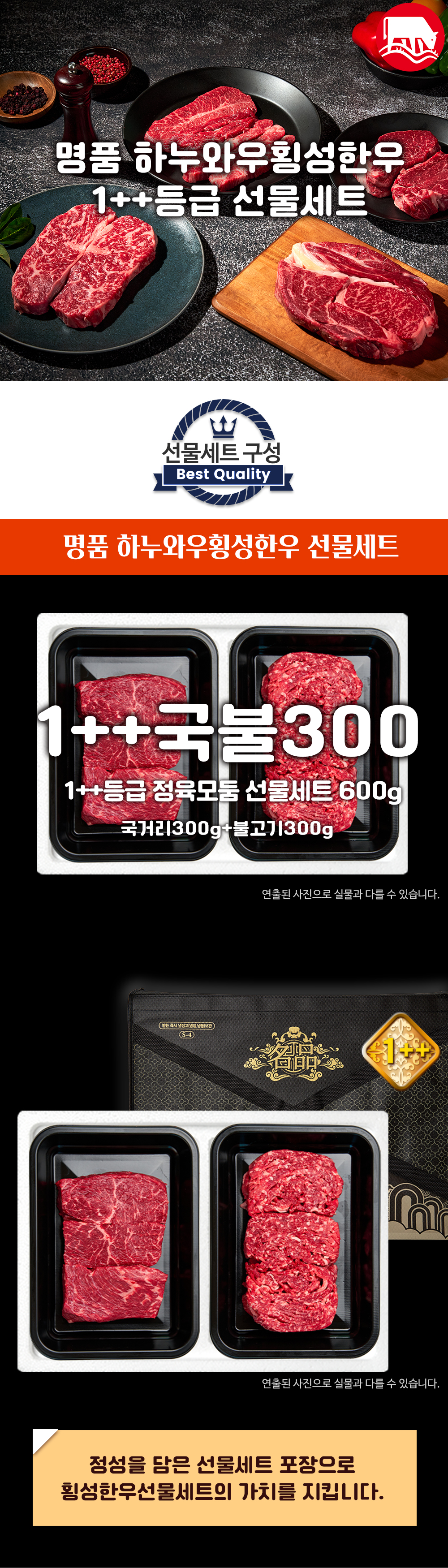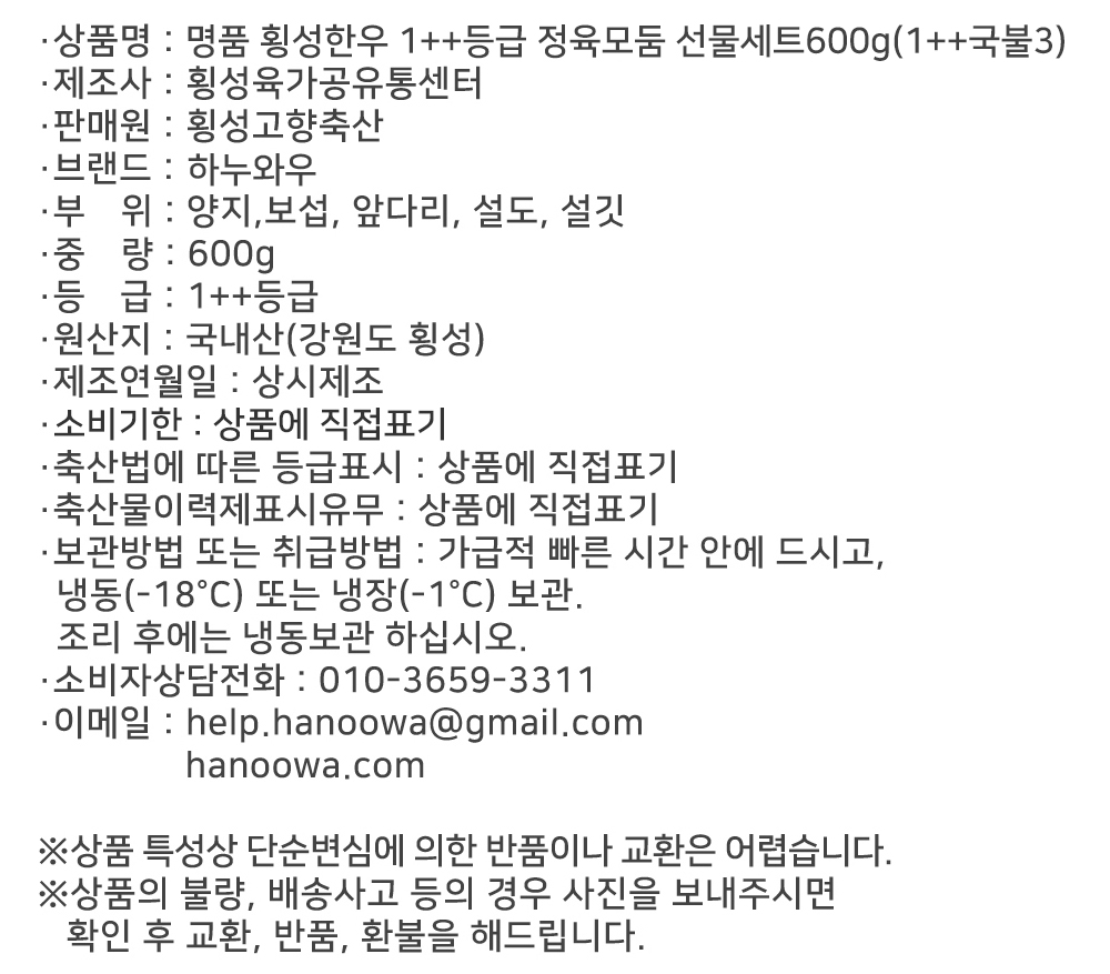 [하누와우]명품 횡성한우 1++등급 정육 선물세트600g(1++국/불3)