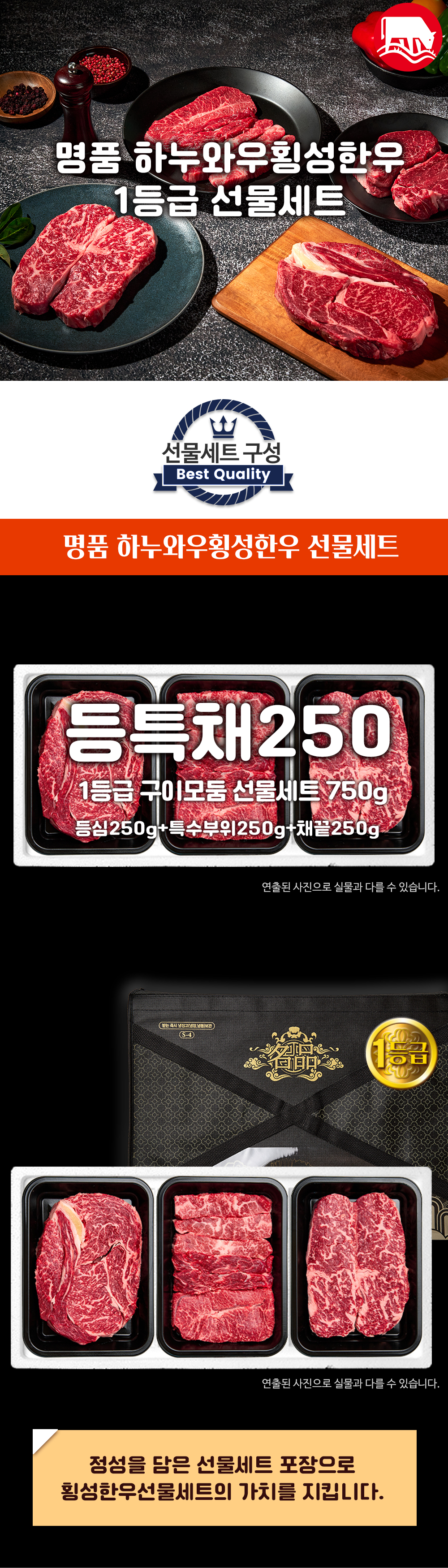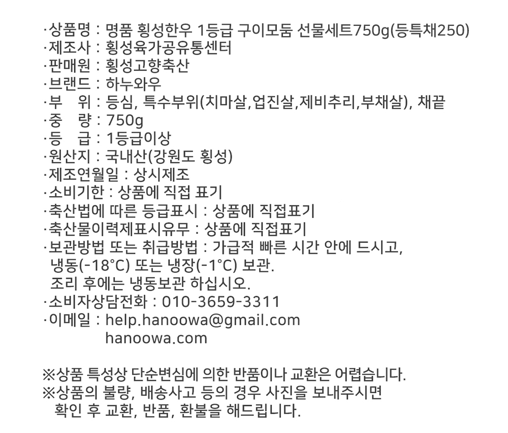 [하누와우]명품 횡성한우 1등급 구이 선물세트750g(등/특/채250)