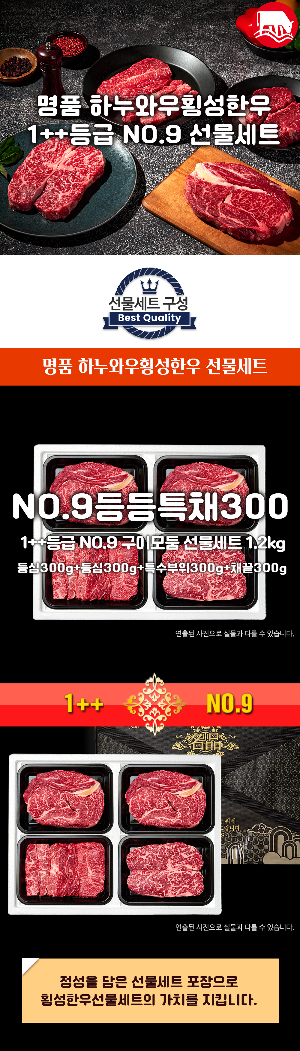 [하누와우]명품 횡성한우 NO.9등급 VIP 구이선물세트1.2kg(no9등/등/특/채3)