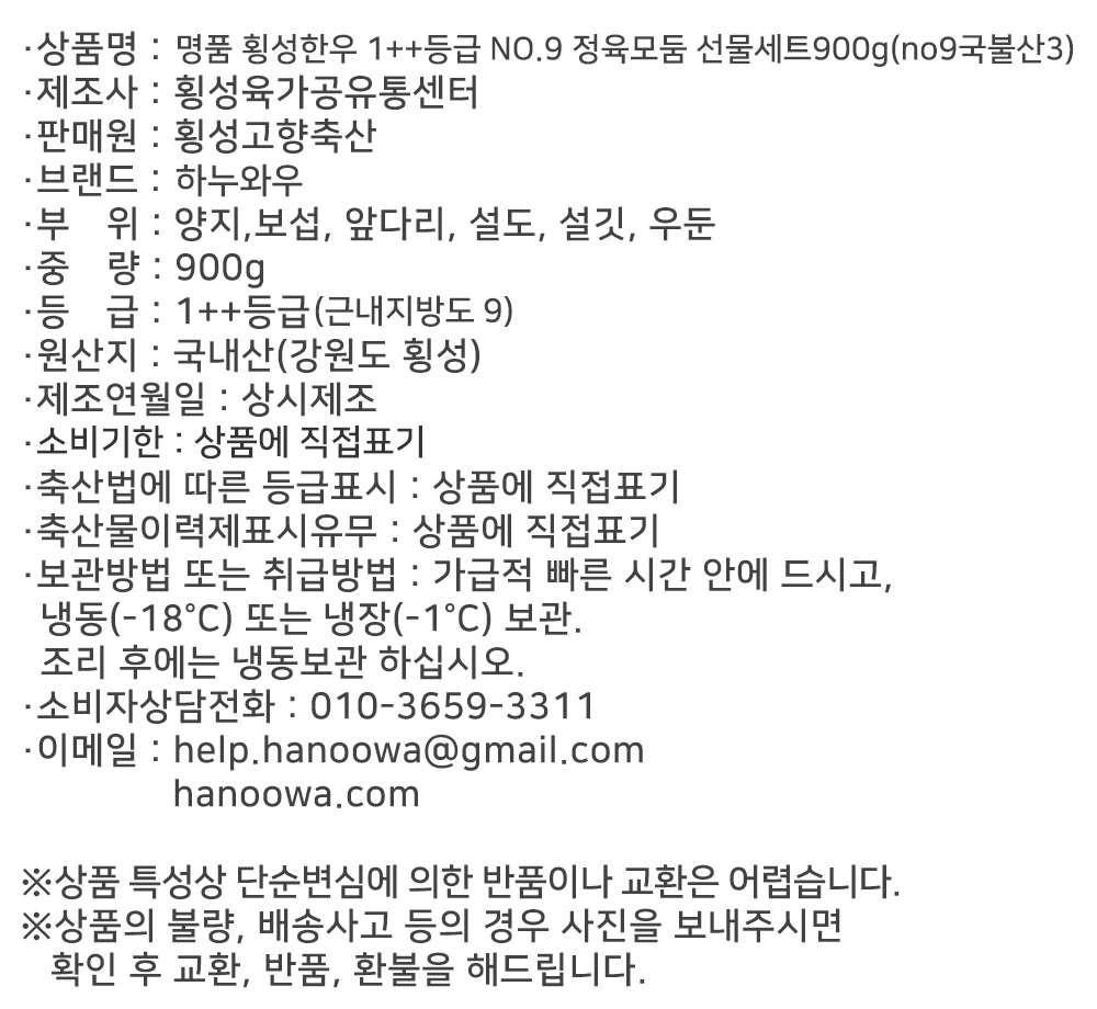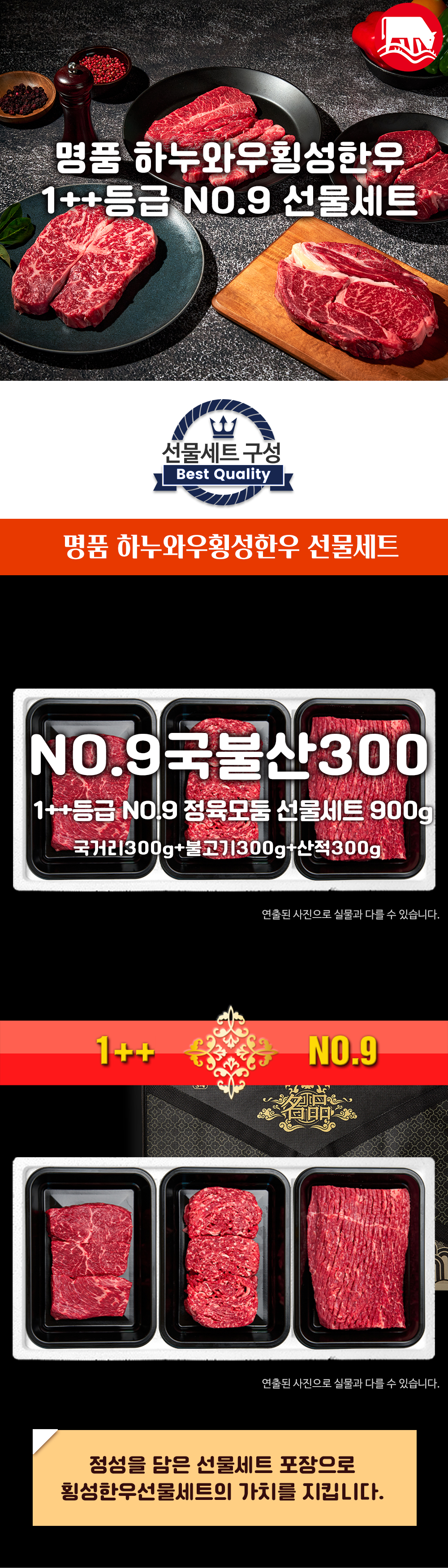 [하누와우]명품 횡성한우 NO.9등급 VIP 정육선물세트900g(no9국/불/산3)