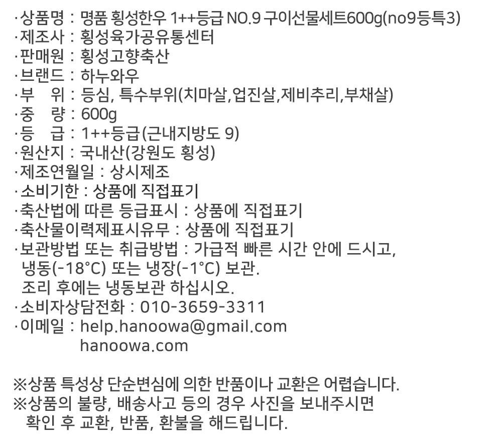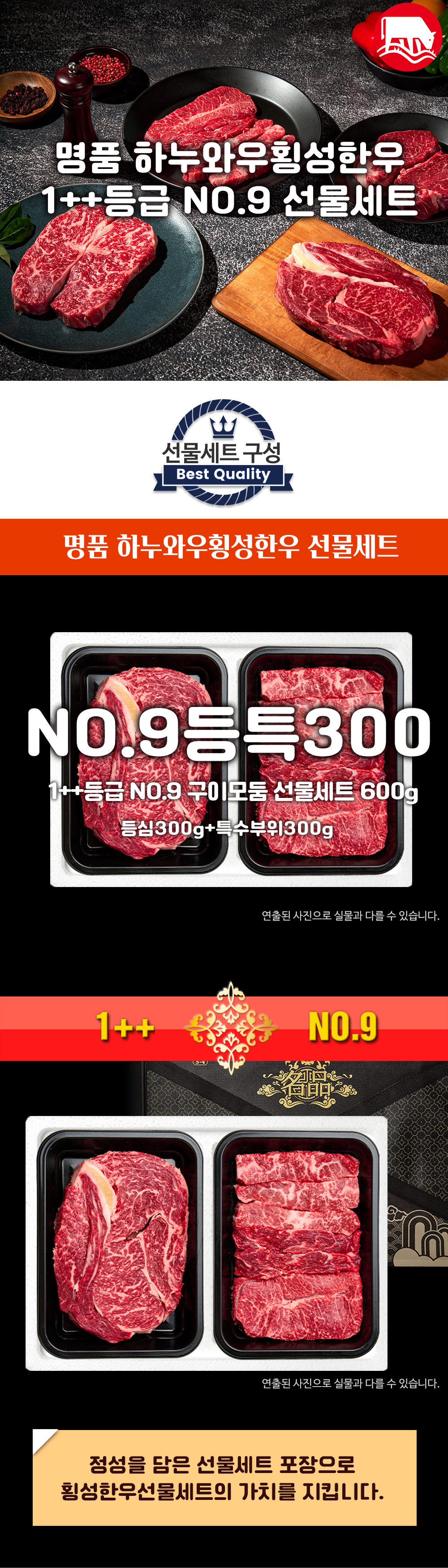 [하누와우]명품 횡성한우 NO.9등급 VIP 구이선물세트600g(no9등/특3)