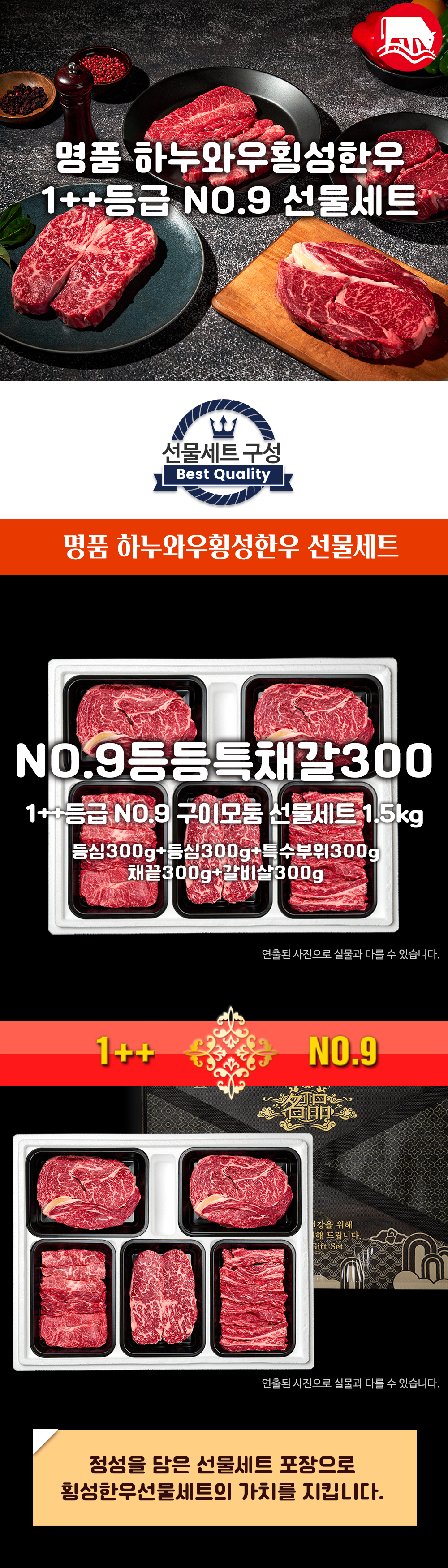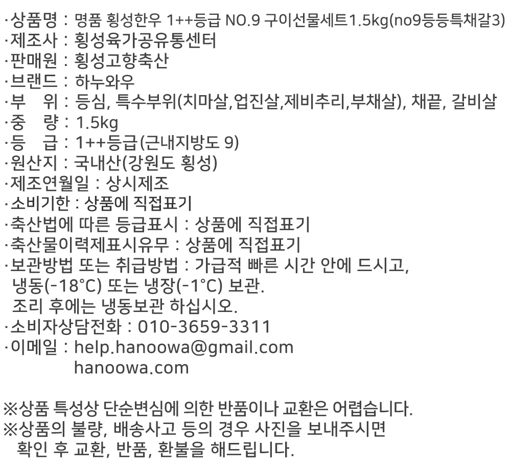 횡성한우 1++등급(NO.9) 1.5kg | 등심300g+등심300g+특수부위300g+채끝300g+갈비살300g