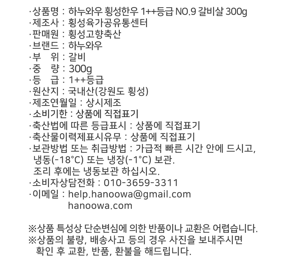 [하누와우]명품 횡성한우 1++등급 가정용 NO.9 갈비살300gSOLDOUT