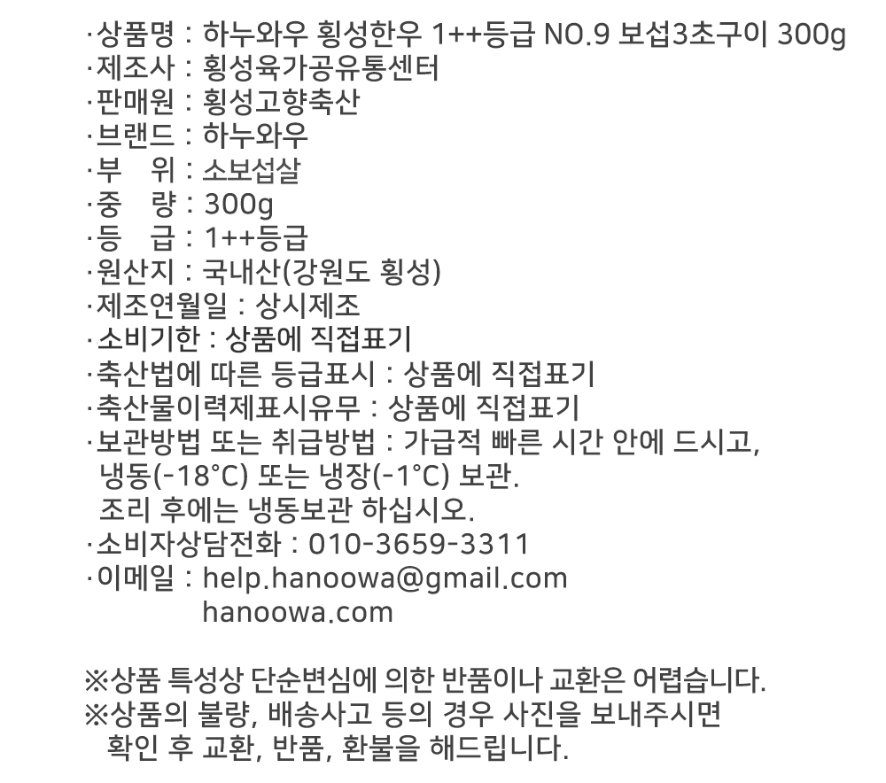 [하누와우]명품 횡성한우 1++등급 가정용 NO.9 보섭3초구이300g