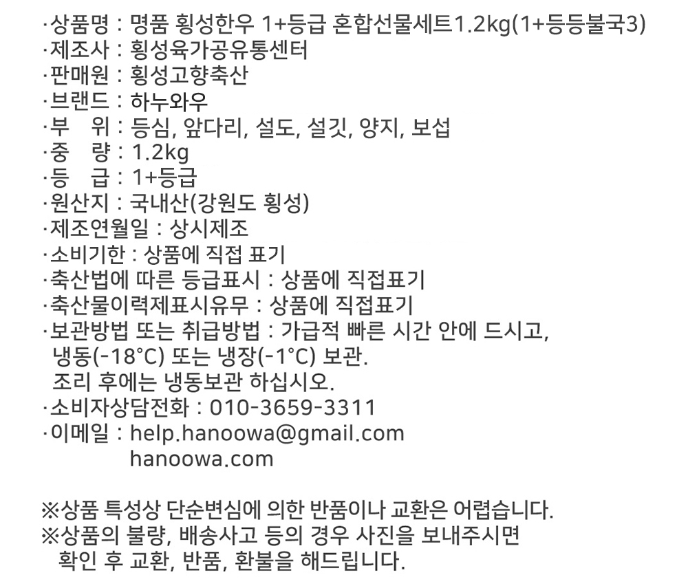 [하누와우]명품 횡성한우 1+등급 혼합선물세트1.2kg(1+등/등/불/국3)