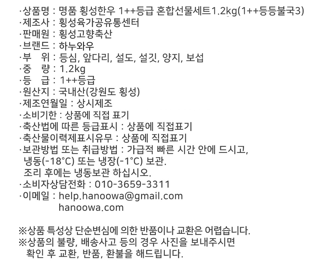 [하누와우]명품 횡성한우 1++등급 혼합선물세트1.2kg(1++등/등/불/국3)