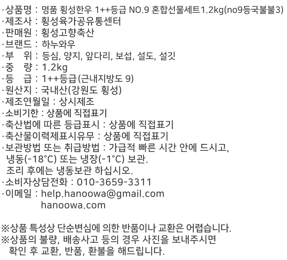 [하누와우]명품 횡성한우 NO.9등급 VIP 혼합선물세트1.2kg(no9등/국/불/불3)