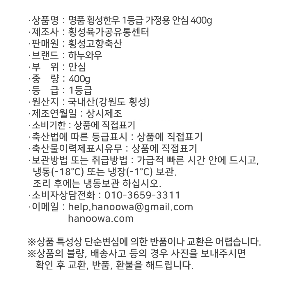 [하누와우]명품 횡성한우 1등급 가정용 안심 400g