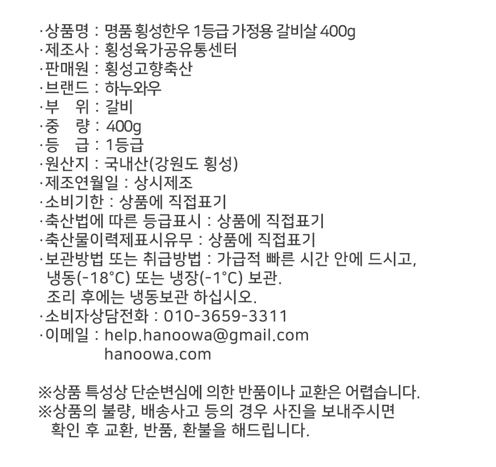 [하누와우]명품 횡성한우 1등급 가정용 갈비살 400g