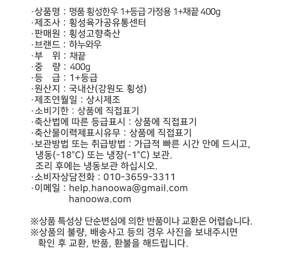[하누와우]명품 횡성한우 1+등급 가정용 1+채끝 400g