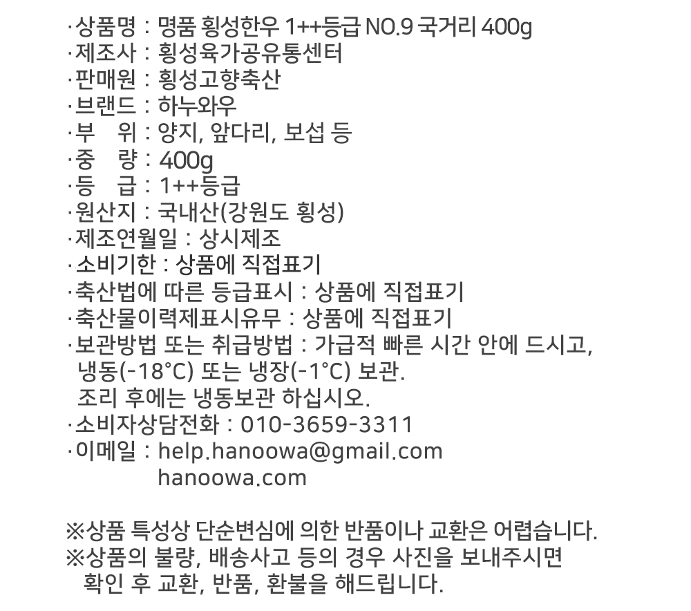 [하누와우]명품 횡성한우 1++등급 가정용 NO.9 국거리400g