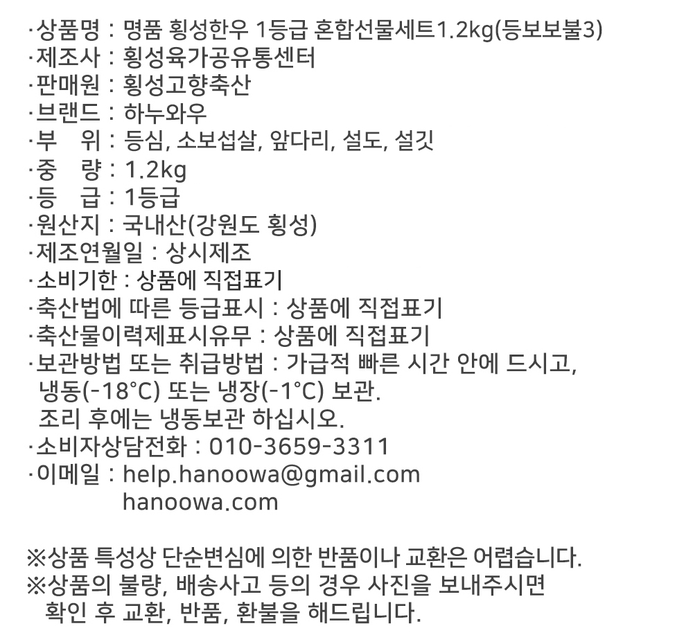 [하누와우]명품 횡성한우 1등급 혼합선물세트1.2kg(등/보/보/불3)