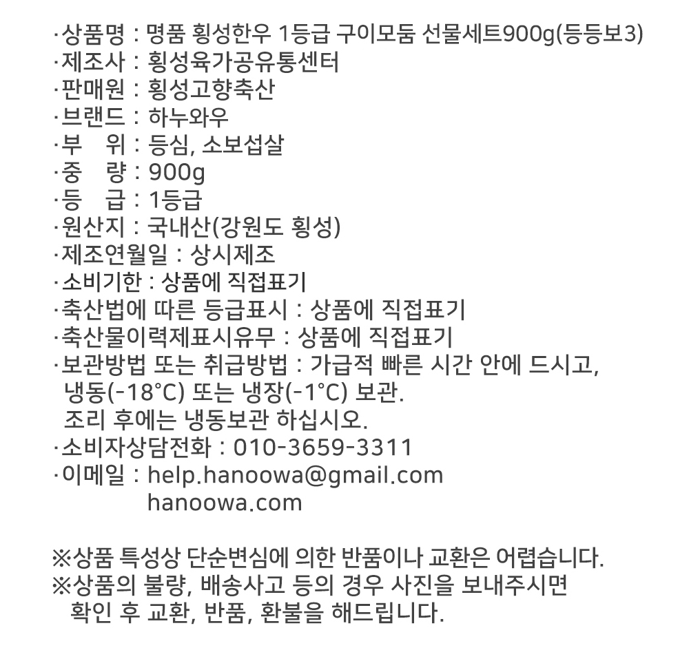 [하누와우]명품 횡성한우 1등급 구이선물세트900g(등/등/보3)