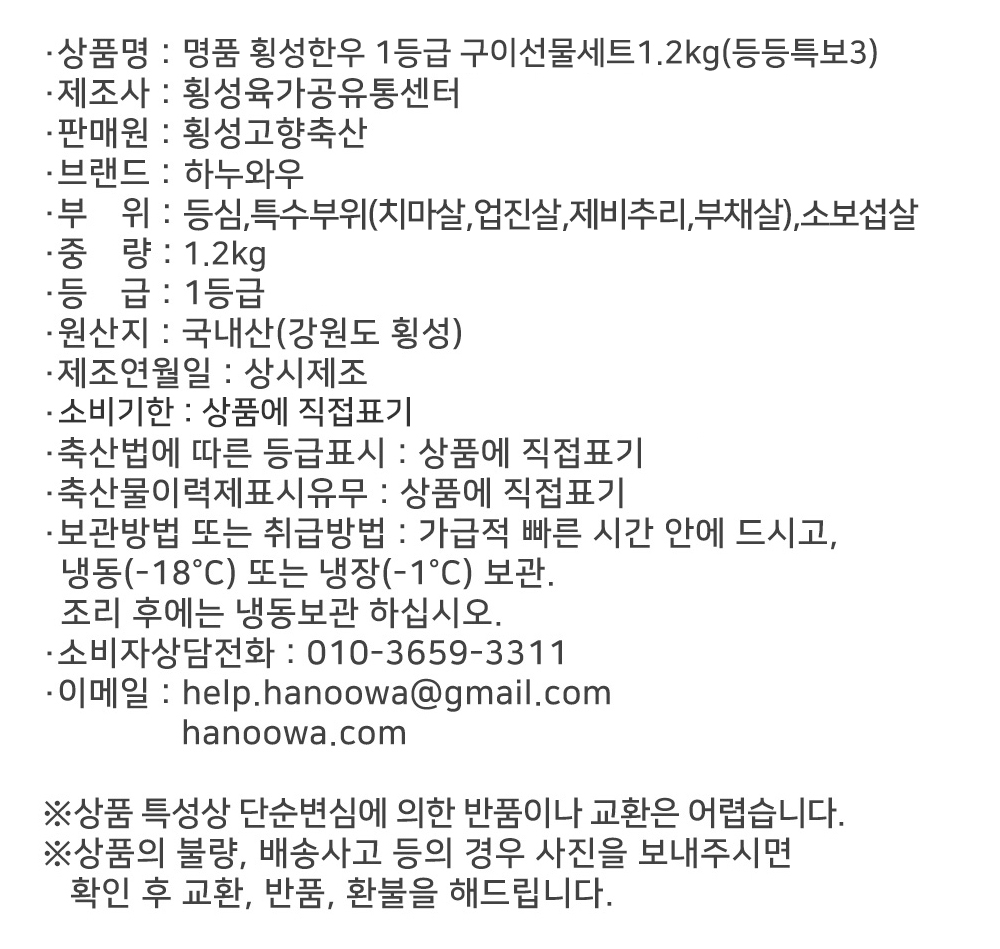 [하누와우]명품 횡성한우 1등급 구이선물세트1.2kg(등/등/특/보3)