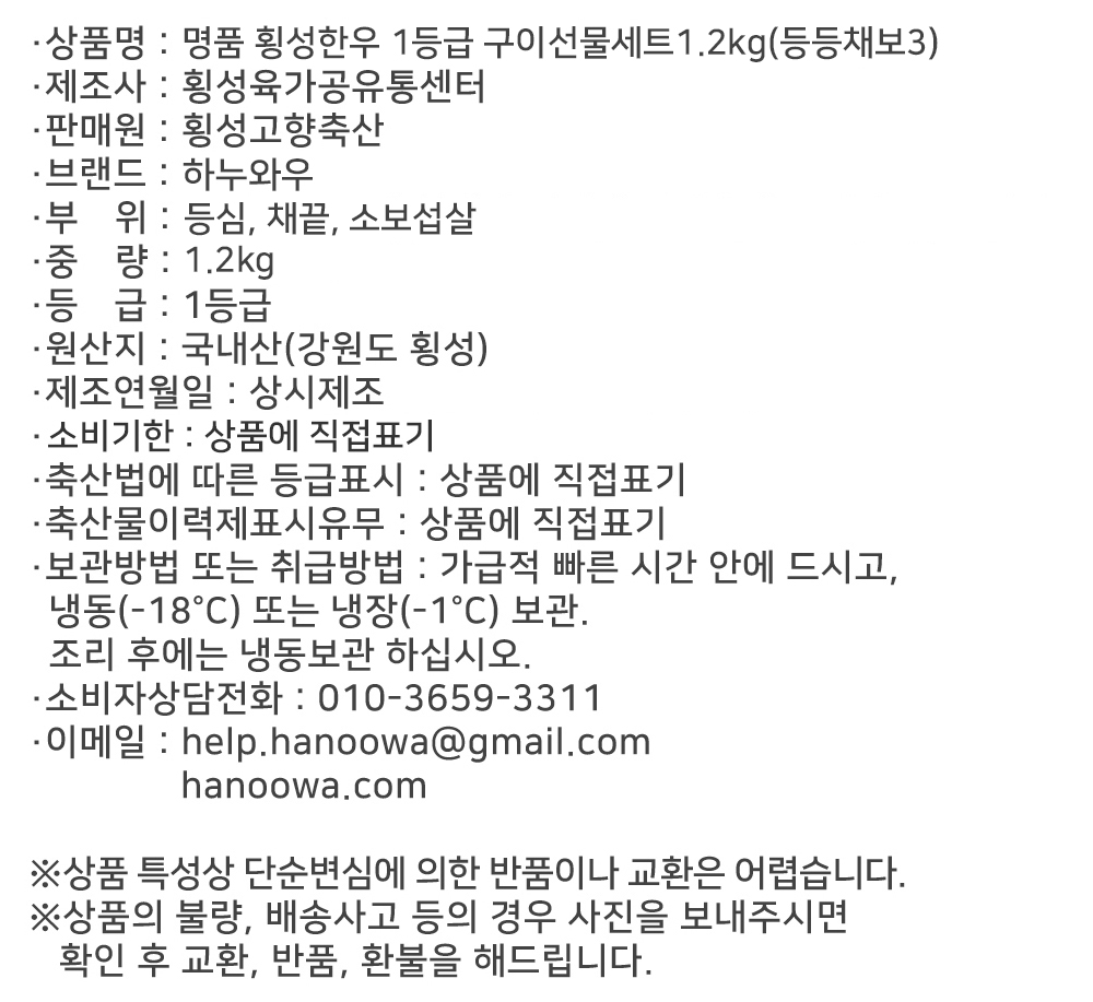 [하누와우]명품 횡성한우 1등급 구이선물세트1.2kg(등/등/채/보3)