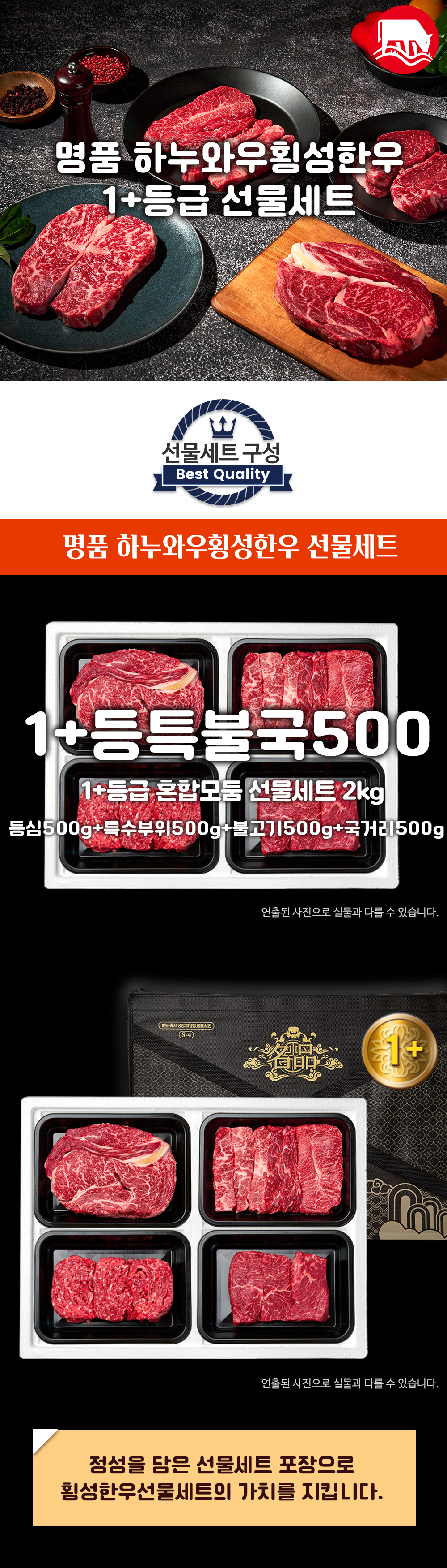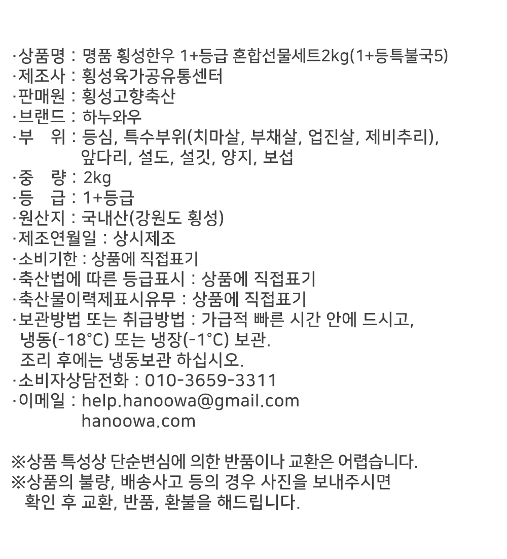 [하누와우]명품 횡성한우 1+등급 혼합선물세트2kg(1+등/특/불/국5)