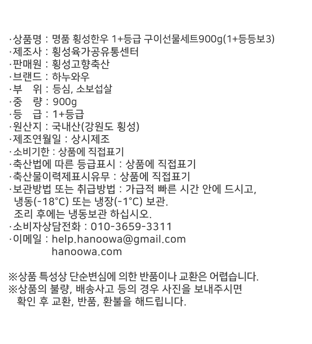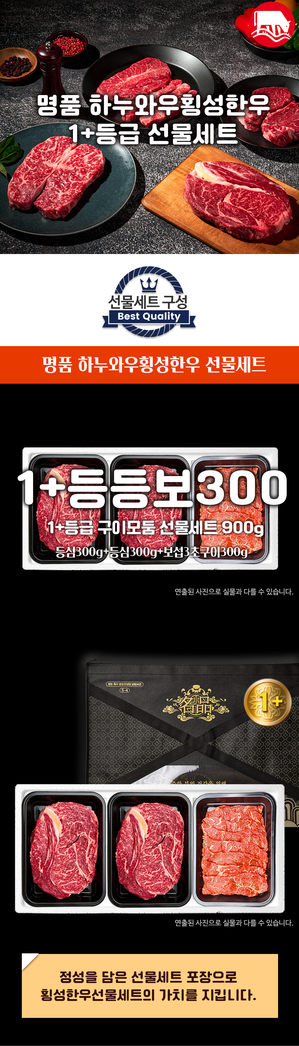 [하누와우]명품 횡성한우 1+등급 구이선물세트900g(1+등/등/보3)