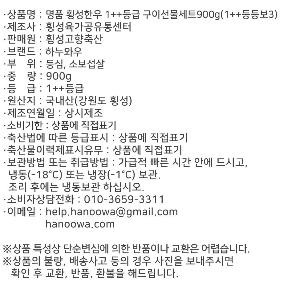 [하누와우]명품 횡성한우 1++등급 구이선물세트900g(1++등/등/보3)