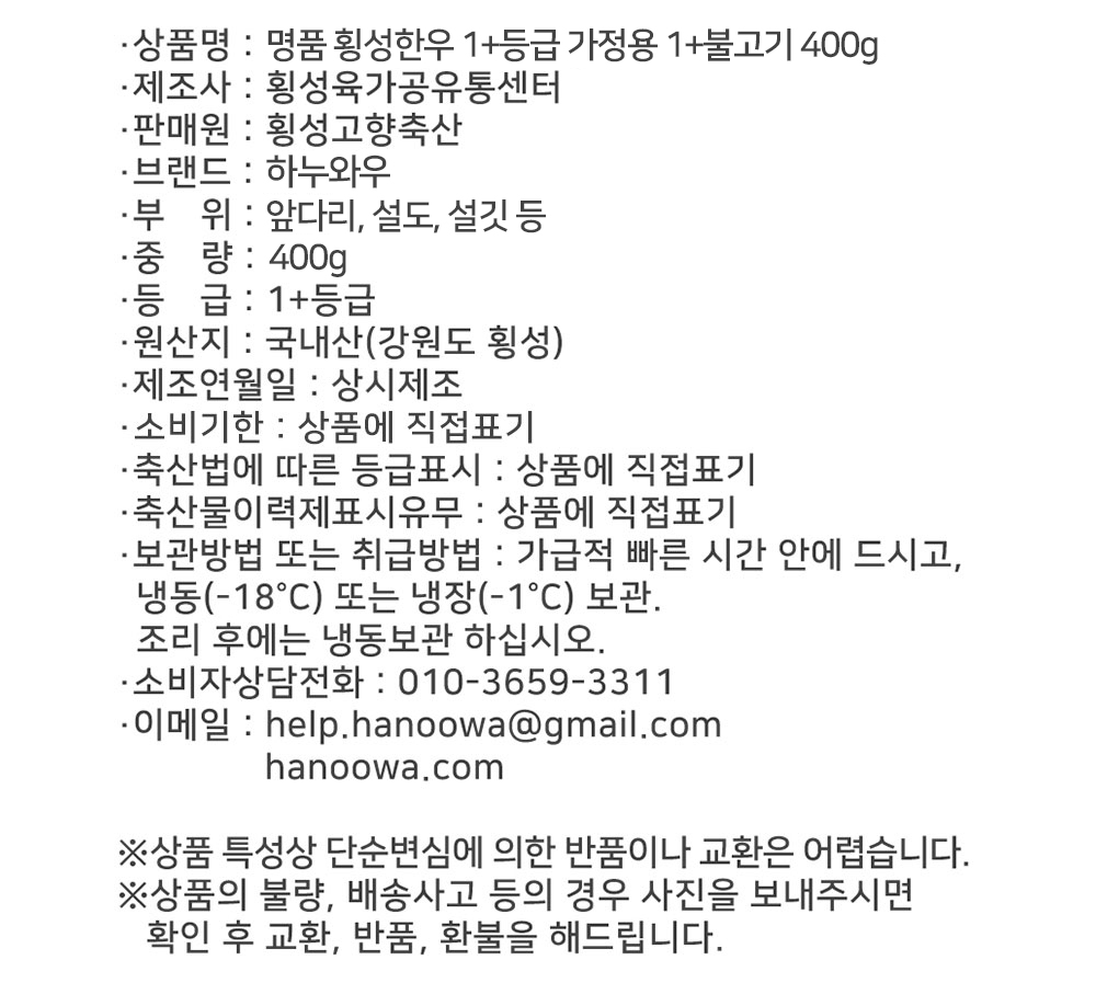 [하누와우]명품 횡성한우 1+등급 가정용 1+불고기 400g
