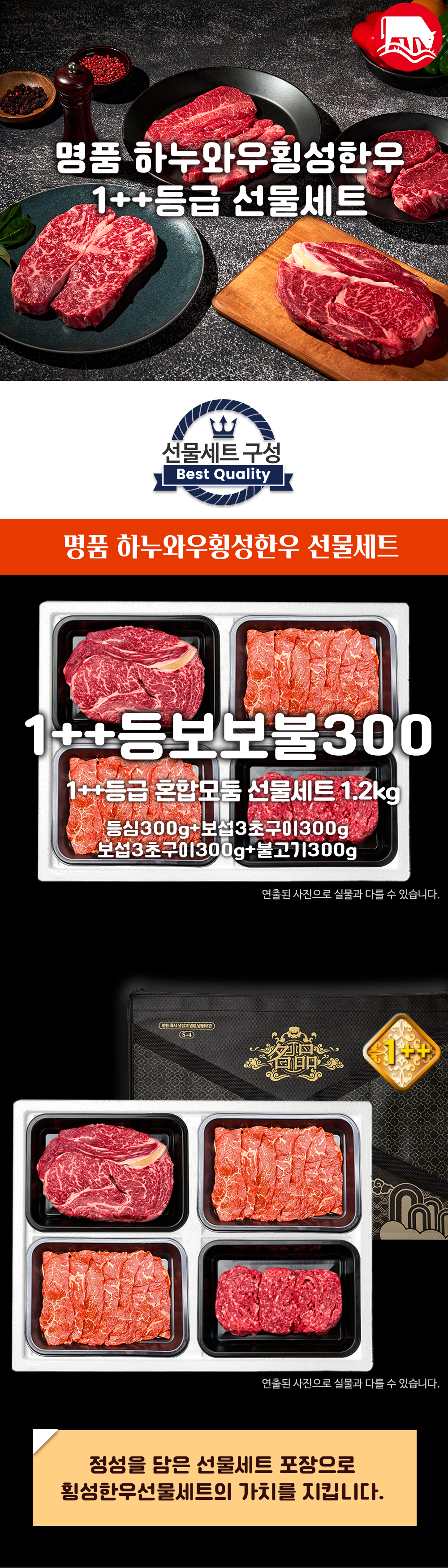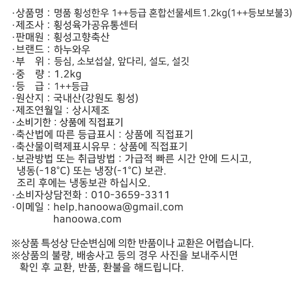[하누와우]명품 횡성한우 1++등급 혼합선물세트1.2kg(1++등/보/보/불3)